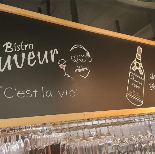 【お二人の時間をお愉しみいただけるデートにオススメ】壁にずらりと並ぶワインがおしゃれな店内には、デザイナーさんが描く黒板アートがあります。落ち着いた雰囲気でやさしい照明でご用意しております。気兼ねなく会話やお料理をお愉しみいただけます♪